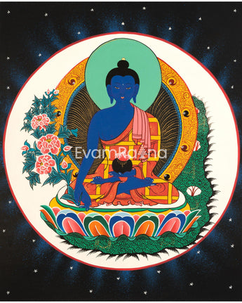 Medicine Buddha, also known as Bhaisajyaguru in Sanskrit, is a revered figure in Mahayana Buddhism, particularly in Tibetan and East Asian traditions. He embodies the healing aspect of Buddha's compassion. According to Buddhist belief, Medicine Buddha has the power to alleviate suffering, both physical and mental, and to bring about spiritual healing. Depicted as a blue-colored Buddha holding a bowl of medicinal nectar, Medicine Buddha is invoked through prayers, meditations, and rituals by those seeking healing for themselves or others. His teachings emphasize the importance of cultivating compassion, wisdom, and mindfulness as essential components of healing and well-being.