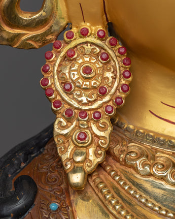 The sculpture is wonderfully fashioned from oxidized copper, giving it a timeless and refined appeal. The dark, deep tones of the oxidized copper provide an ideal backdrop for the statue's brilliant 24K gold plating. This beautiful gold finish, along with precise gold and acrylic paints, brings out the complex intricacies of Saraswati's body, from her graceful posture to the sacred instruments she carries.