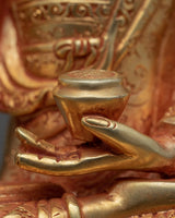 The Shakyamuni Buddha statue is a magnificent work of art that exudes artistry and devotion. The statue, which is entirely made of copper, is a labor of love and dedication to the Buddha's teachings. The statue's face is gilded in gold, which adds brightness to the facial features and evokes amazement and reverence. We used a hammer and small chisels to hand-carve the intricate design patterns. The rest of the body is gold-plated, creating a warm, inviting glow that represents the Buddha's spiritual enlightenment.
