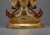 Through the help of our Seated Four-Arms Chenrezig Statue, enter the realm of compassion and enlightenment. The work of art, which was carefully crafted, captures the spirit of Chenrezig, the god of compassion and knowledge. This sculpture, which stands an amazing 19.1 inches tall and weighs 8.40 kg, exudes grace and serenity. It is a focal point in any space thanks to its delicate acrylic paints and 24K gold plating, which give it an air of elegance and beauty.