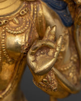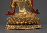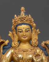 This magnificent Green Tara in Buddhism Statue, measuring 8.5 inches (21.5 cm) tall with a base width of 6.7 inches (17 cm), is a stunning work of art weighing 2.35 kg. This statue is meticulously created from a copper body and has 24K gold gilding as well as intricate gold and acrylic paintings that capture the calm and grace of Green Tara, a famous deity in Tibetan Buddhism.