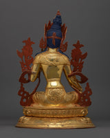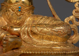 The Serene Green Tara Statue, reaching 12.4 inches tall, exudes a profound sense of compassion and protection. The delicate gold and acrylic paintings, which have a copper body and sumptuous 24K gold gilding, accentuate Green Tara's divine beauty and serene expression. Her posture and calm manner represent fast action in times of need, shielding followers from fear and harm.