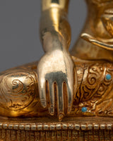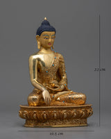 Savor the sublime artistry of the Serene Shakyamuni Buddha Figurine, which is expertly carved from copper and lavishly covered in brilliant 24K gold gilding. The subtle qualities of Shakyamuni Buddha's robes and calm countenance convey his enlightenment and inner tranquility. This sculpture, enhanced with elaborate paintings in gold and acrylic, emits a serene and spiritually graceful aura that invites reflection and adoration. The Shakyamuni Buddha statue, carefully handcrafted with attention to detail, embodies the ageless lessons of compassion and wisdom, providing comfort and direction to anyone who seeks it.