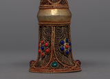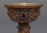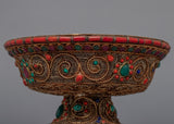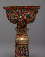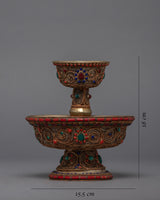 The Serkyem Offering is made from a copper body with beautiful gold stones attached. It is handcarved with details done very finely throughout the Serkyem Set, making it an incredible addition to your house.