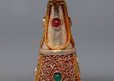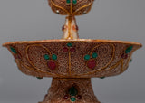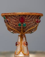 On a copper body, the Serkyem Offering set is expertly made. The meticulously inlaid gemstones increase the set's beauty and value. Enlightened beings receive a beverage comprised of two liquids, often water and alcohol, in the traditional Tibetan ceremony known as the Serkyem Offering. The set includes two cups, one smaller and one larger, to represent the two liquids.