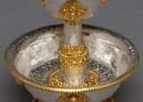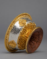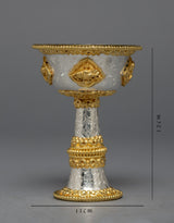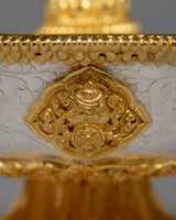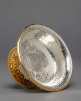 The Serkyem Set, meticulously handcrafted from copper, radiates a timeless elegance that seamlessly blends with its spiritual significance. Adorned with the lustrous touch of 24k gold and silver plating, this set takes on a resplendent allure, capturing the essence of devotion and sacred ritual. It's artful design and intricate detailing not only make it a captivating visual masterpiece but also a vessel for the profound act of serkyem offering—a gesture of reverence and gratitude. With each graceful curve and gleaming finish, this offering set invites practitioners to partake in an ancient tradition, bridging the material and the spiritual through a harmonious synthesis of craftsmanship and ritual practice.