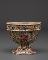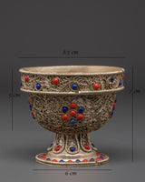 Each bowl in this set weighs roughly 0.13kg, for a total set weight of 1.05kg, making them strong enough for altar stability while remaining easy to arrange or transport. Their intricate craftsmanship and gemstone inlays give them a beautiful, ceremonial aura, making them suitable for daily offerings, pujas, and meditation sessions. When combined with water, flowers, or rice, they are potent spiritual tools that enrich holy rituals and connect practitioners to the heritage of Buddhist offering traditions.