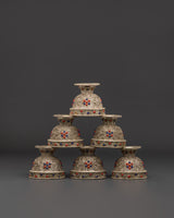 Honor your spiritual rituals with this Set of 7 Tibetan Offering Bowls, elegantly handcrafted from copper and silver-plated for a sacred and dazzling presence. Each bowl has elaborate motifs inlaid with brilliant artificial coral and turquoise stones, mirroring traditional Tibetan aesthetics and symbolism. These bowls, which measure 7cm in height, 8.5cm in circumference, and 5cm in inner depth, are used in Buddhist practice to provide symbolic water offerings that reflect generosity, cleansing, and dedication.