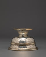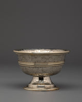 Crafted from white metal, the bowls are designed to represent the seven symbolic offerings: water for drinking, water for washing, flowers, incense, light, perfume, and food. Placed in a straight line and filled during puja rituals, they cultivate merit, mindfulness, and generosity. This handcrafted set is perfect for both beginners and devoted practitioners seeking to enrich their meditation space or altar with authentic Tibetan ritual items.