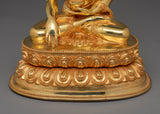 This Shakyamuni 24K gold Buddha statue stands 11.8" (30 cm) tall with a 9.4" (24 cm) base and weighs 3.15 kg. It is crafted from copper and enhanced with detailed gold and acrylic decor to depict the Buddha's enlightenment. Sitting in the essential vajra (lotus) posture, the Buddha's right-hand contacts the environment in the bhumisparsha mudra, representing the crucial moment when Shakyamuni Buddha created the Earth to witness his enlightenment. His left hand is resting in his lap, carrying a bowl in the dhyana mudra, which represents concentration and detachment from earthly desires.