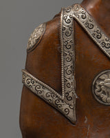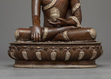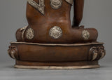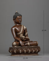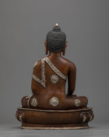Our Shakyamuni Buddha 35cm Figure is an artistic handiwork that combines spiritual importance with great crafting. This statue, which stands 13.8 inches tall on a base that is 9.8 inches wide, is skillfully made of an oxidized copper body that is perfectly contrasted with a silver-plated finish that highlights the intricate carvings. Shakyamuni Buddha's robe has eight finely carved auspicious symbols made of silver. These symbols each reflect a particular component of Buddhist teachings and the path to enlightenment, adding a depth of profound spiritual meaning.