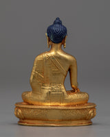 This Buddhist Shakyamuni Buddha Statue is made of copper that has been 24K gold plated. This machine-made Buddha Siddhartha Gautama Shakyamuni statue is a beautiful piece of art representing the important moment in Buddhist history when Buddha overcame the world's temptations and achieved enlightenment. Shakyamuni's right hand reaching for the earth, also known as the Bhumisparsha Mudra, symbolizes his victory over Mara and his determination to remain grounded in his path to enlightenment.