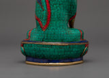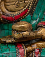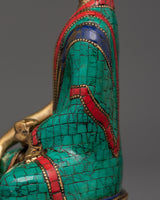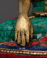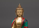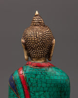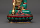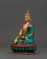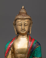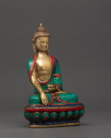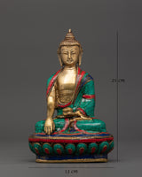 This colorful Shakyamuni Buddha Brass Statue is handcrafted from brass and inlaid with Artificial coral and turquoise. It is a historical symbol of enlightenment and spiritual understanding. At 21 cm by 13 cm by 13 cm and weighing a stunning 1.70 kg, it is a work of art for your home altar, meditation corner, or sacred area that is also spiritually essential.