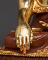 Shakyamuni Buddha is depicted in the classic meditation stance, with his right hand touching the ground in the "Bhumisparsha Mudra," indicating his enlightenment under the Bodhi tree, and his left hand holding a cup of nectar, symbolizing spiritual nourishment and purity. His tranquil expression and the beautiful artwork on his robes reveal inner serenity and knowledge. The carefully made curls in his hair and the urna symbol on his forehead represent his enlightened status.