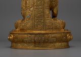 This statue, which is made of a sturdy copper body and lavishly covered in dazzling 24K gold gilding, depicts Shakyamuni Buddha in his contemplative pose and calm manner. The elaborate paintings in gold and acrylic accentuate his empathetic countenance and the elaborate robes, which are further embellished with gemstones that lend an air of grandeur and respect. Its 4.07 kg weight is balancing and uplifting, making it perfect for creating a calm atmosphere that encourages introspection and meditation.