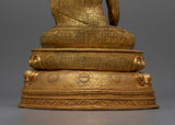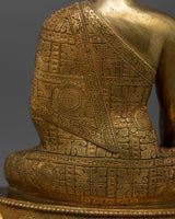 This Shakyamuni Buddha Handcrafted Antique-Touch Statue stands 36.5 cm tall and is made of high-quality copper with gorgeous 24K gold gilding that showcases the intricate features of his monastic robes and tranquil facial expression. The statue weighs 3.19 kg, which provides stability and presence. Each fold of the robe and feature of Buddha's serene expression is precisely highlighted, showcasing the fine artistry involved.