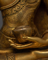 The Shakyamuni Buddha Handmade Antique Touch Statue is superbly constructed from pure copper and features an antique finish and 24K gold gilding, measuring 39.5 cm in height. This statue is a perfect addition to any area looking to instill knowledge and calm since it perfectly depicts the serene and contemplative presence of Shakyamuni Buddha. The deity's delicate features and well-known meditation stance are emphasized by the fine details and brilliant gold finish, signifying his function as the enlightened teacher.
