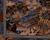 This beautiful medium large-sized Thangka painting of Shakyamuni Buddha’s life events was completed in early January 2015 by a senior artist Mr.Gyalsang Lama. Mr.Gyalsang learned to paint Thangka from an early age and gradually specialized in painting fine art Japanese-style thangka paintings. This Buddha life story is one of the few thangka paintings he has completed adopting the techniques of fine art Japanese style mutated with traditional Tibetan Menri style. The use of nude shades of colors which is very much prominent in traditional Japanese fine art style has been blended perfectly in contrast to the traditional bright use of colors in the Tibetan style of traditional paintings.