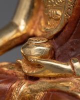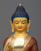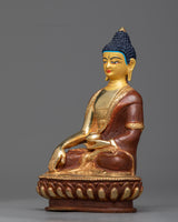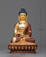 This statue, which was meticulously designed with every detail in mind, invites meditators and mantra practitioners to fully immerse themselves in the profound wisdom of Shakyamuni Buddha. The statue's presence as a representation of enlightenment and inner serenity is enhanced by the bright gold plating, which gives a celestial shine. Let the calm expression of Shakyamuni Buddha, whether it be on your meditation altar or in a special place, inspire peace and introspection as it leads you to spiritual awakening and freedom from suffering.