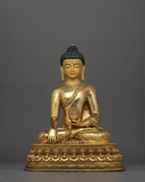 The Shakyamuni Buddha with Halo is a sculpture representing Buddha's awakened knowledge, beautifully carved to encourage peace and spiritual growth. This artwork weighs 3.36 kg and measures 14.2"/36cm in height with a base width of 9.3"/23.5cm. It is constructed of copper, gilded with 24K gold, and adorned with gold and acrylic paints. The halo around the Buddha creates a divine aura, demonstrating his enlightened presence, making this sculpture an ideal addition to any meditation place or sacred shrine.