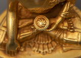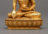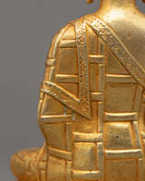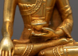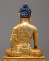 The body of this small statue of Shakyamuni Buddha was machine sculpted and electroplated with genuine 24k gold. In this Buddhist sculpture, he is seated on top of a moon disc lotus seat, with a serene expression. His left hand is holding an alms bowl, and his right hand is performing the earth-touching mudra. This small sculpture would make an excellent gift for a practitioner like you.