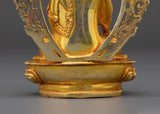 The statue is expertly machine-crafted from a copper body and features gold plating, giving it a beautiful glow. Its elaborately patterned flower throne lends a sense of religious grandeur to the sculpture, enhancing its visual harmony. Despite its small size and weight of only 0.29 kg, the tranquil expression on its face, elegant stance, and meticulous details distinguish it as a unique spiritual artifact.