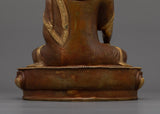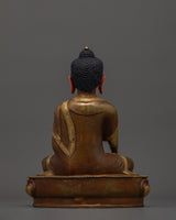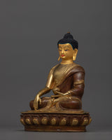 The Shakyamuni Buddha Symbol of Enlightenment represents knowledge and spiritual awakening. This statue stands 10.4"/26.5cm tall and weighs 2.36 kg. It is made of oxidized copper, delicately gilded with 24K gold, and adorned with gold and acrylic paintings that express its sacred energy. This sculpture depicts the historical Buddha, Shakyamuni, and represents enlightenment, the way to inner peace, and the transformation of suffering into wisdom.