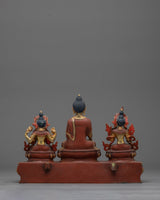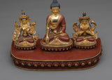 Take the Shakyamuni Buddha with Sitatara and Chenrezig statue on a spiritual journey towards enlightenment. The Buddha's compassion and wisdom are embodied in this finely detailed sculpture. Seeking inner serenity and enlightenment, this sculpture, which stands 11.6 inches tall with a 12-inch circle base, serves as a reminder. This statue exudes spiritual energy and is adorned with elaborate acrylic paintings and 24K gold plating.
