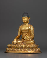 Shakyamuni Copper Statue Handcrafted by expert craftsmen in Nepal, this statue has a copper body and is gilded with 24k gold. The Gold and Acrylic Paintings highlight the fine details, from the folds in his robes to the peaceful smile on his face. The statue is given an Antique Finish, which adds to its timeless beauty and depicts the ancient knowledge of Shakyamuni Buddha. This finishing process gives the statue a sense of history, making it appear to be passed down through centuries, bearing the Buddha's teachings.