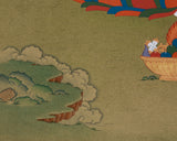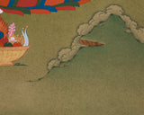 The Buddha sits on a lotus base adorned with fine detailing; his serene appearance and position symbolize a state of peace and enlightenment. His innocence and spiritual insight are emphasized by the moon disc on the lotus base beneath him. The bright halo behind his head is highlighted by outward-pointing rays, signifying the immense wisdom that encompasses the cosmos. The background depicts clouds and distant mountain ranges, common motifs in Tibetan thangka painting that represent the universe's vastness and emptiness. The gentle green tones of the background stand for harmony and tranquility. This thangka serves as a visual encouragement to follow the path of mindfulness, discipline, and inner calm. It is ideal for meditation areas, shrines, or thoughtful spaces.