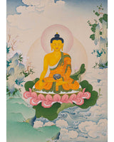 Shakyamuni Buddha Thangka is painted in natural stone color and 24k gold. He is seated with a crossed leg atop a moon disc lotus seat. His right hand is in the Earth Touching mudra, while his left hand rests on his lap, carrying a begging bowl with a clam face. This small Shakyamuni Buddha Painting can be your ideal thangka to take with you wherever you go.