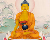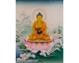Buddha Shakyamuni is pictured in the center of this exquisite Traditional Buddha thangka. Our artist has painted this thangka in Natural Stone colors and 24K Gold. The background is surrounded by trees, flowing rivers and streams, and mountains that adds a positive vibes to a practitioners like you. An orange halo illuminates his face, and he sits atop a moon disc lotus seat that engulfs him. His right hand is in Earth touching Mudra, while his left hand, holding a begging bowl, is resting on his lap.