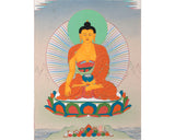 This Buddhist wall scroll painting of Shakyamuni Buddha using acrylic colors is painted in the ancient Karma Gadri. In the brocade thangka, Amid a cover of white clouds, Buddha sits on a moon disc lotus seat that appears to be floating in the air near the lake with colorful petals. His right-hand gestures to touch the earth while his left hand holds a begging bowl. He wears an orange robe draped around his body while his left arm is bare, representing the traditional buddha style. The bright halo and the bright nimbus behind him give the thangka a divine look.