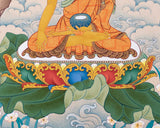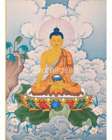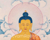 Step into the sacred realm of divine serenity with our Hand-Painted Shakyamuni Buddha Thangka, a masterpiece meticulously crafted on a premium cotton canvas. Each stroke of the artist's brush unveils the compassionate presence of Shakyamuni Buddha, capturing the essence of enlightenment. Painted with natural stone colors, the canvas radiates an organic and timeless aura, inviting contemplation and connection with the spiritual depth of the Buddha's teachings. What sets this thangka apart is the infusion of genuine 24K gold, delicately applied to add a transcendent luminosity. The gold accents symbolize the profound wisdom and enlightened qualities associated with Shakyamuni Buddha. This artistic fusion of natural stone colors and gold creates a harmonious masterpiece, an exquisite visual journey that inspires reflection and brings the divine energy of the Buddha into your sacred space.