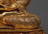 With its impressive 17.3-inch height, this Siddhartha Gautama Buddha Statue is a monument to the fine craftsmanship of Tibetan artists. This statue embodies the heavenly peace of the awakened presence of Buddha. It is handcrafted with a copper body and embellished with beautiful 24K gold gilding. The substantial 14-inch base offers a framework for this imposing work of spiritual art, and the elaborate paintings in gold and acrylic highlight the subtle features of the Buddha's face and garments. This statue, which weighs 7.80 kg, is intended to be the center of attention in your sacred area and to provide both aesthetic appeal and spiritual meaning.