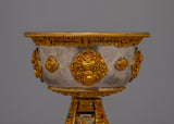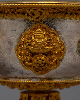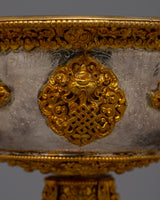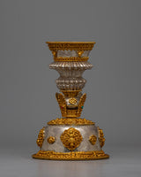 The Silver Butter Lamp Set is a beautiful example of traditional craftsmanship with spiritual meaning. Handcrafted, this magnificent set combines pure silver and copper with gold plating, resulting in a well-balanced combination of materials and finishes. The substantial and high quality of the set is reflected in its overall weight of 1.292 kg.