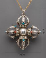 Silver Double Vajra Locket | Double Dorje Pendant With Stone Embroid