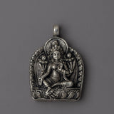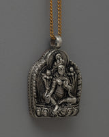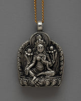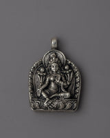 The stunning handcrafted Silver Ghau Box is exquisitely made from fine silver. This exquisite box, which is 4 cm tall, has a finely made Green Tara locket, which represents protection and compassion. The intricate silverwork on the front of the box demonstrates the artist's commitment to maintaining age-old methods and producing an exquisite object with deep spiritual meaning.