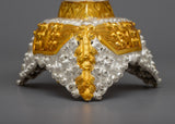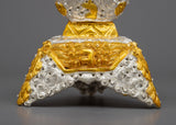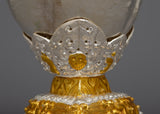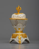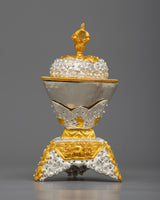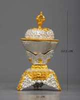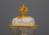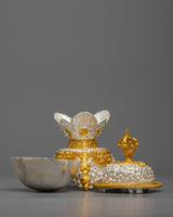 Presenting the magnificent Silver Plated Kapala Set, which combines traditional workmanship with holy symbolism. Each item in this set is expertly embellished with 24k gold and silver plating, and it is handcrafted on a copper body. Measuring 20.5cm in height and weighing a total of 0.64kg.