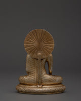 This silver-plated Shakyamuni Buddha statue, symbolizing tranquility and spiritual wisdom, is a polished work of sacred art suitable for personal altars and reflective spaces. The compact yet detailed sculpture, measuring 11cm in height and 9cm in breadth, depicts the historical Buddha in a meditative seated posture with the earth-touching mudra (Bhumisparsha).