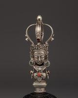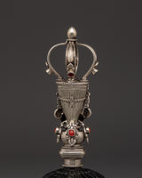 With the Silver-Plated Tibetan Bell and Vajra Set, an exquisitely designed ritual tool combination essential for Buddhist ceremonies and meditation rituals, you can deepen your spiritual practice. The set is made of copper and has a silver plating. Artificial coral stones are used to add a classic yet colorful touch. This handcrafted silver-plated bell and vajra set is a vital addition to any spiritual altar. It is a potent tool for strengthening spiritual ties, deepening meditation, and grounding energy.