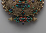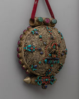 A stunningly created object that captures the rich traditions of Tibetan Buddhism is the Silver Plated Tibetan Ghau Box. This Ghau box has a copper body with a sophisticated silver plating finish. Electro-gold plating adds an opulent layer of detail. Lapis lazuli, coral, and Panna, three semi-precious stones that have been expertly inlaid to enhance the box's aesthetic and spiritual worth, are the embellishments. These stones are more than just ornamental; they have profound symbolic significance. For example, the stone lapis lazuli is associated with wisdom, coral with protection, and Panna with prosperity and healing.