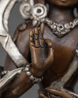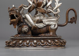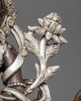 The Simhanada Chenrezig Avalokiteshvara Statue, an embodiment of compassion and knowledge, is precisely built from oxidized copper and gracefully plated in silver. Standing at an astounding height of 9.4 inches (24 cm) and with a base width of 7.7 inches (19.5 cm), this statue, weighing 2.53 kg, makes it a remarkable focal point in any area, offering peace and spiritual connection.