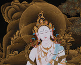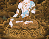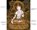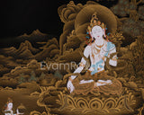 Immerse yourself in the divine presence of Sita Tara with this exquisite 24K Gold Thangka. Known for her compassionate nature and healing abilities, Sita Tara embodies the essence of the divine feminine in Tibetan Buddhist art. This meticulously painted Thangka captures her serene countenance, adorned with intricate details in shimmering gold, including her white complexion symbolizing purity and wisdom. Her multiple eyes and arms symbolize her ability to see and reach out to those in need, embodying compassion and healing. Ideal for meditation and spiritual practice, this artwork radiates compassion and healing energy, making it a cherished addition to any sacred space dedicated to Vajrayana Buddhism.