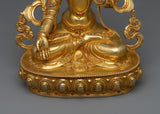 The Sita Tara Goddess Statue, a luminous emblem of divine knowledge and grace, invites you on an enlightening journey. The statue itself, which has a base diameter of 9.1 inches and a height of 12.2 inches, was carefully crafted of pure copper and covered in layers of 24K gold gilding. The flawless acrylic and gold paintings highlight the statue's heavenly atmosphere, and the skilled craftsmanship perfectly embodies White Tara's awakened spirit. Every little thing embodies the infinite wisdom and compassion of the divine feminine, arousing in everyone who sees her awe and devotion.