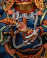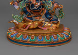 This statue, made of high-quality copper and gilded in 24K gold, brings Mahakala's terrifying aspect to life with beautiful detail in his six arms, each clutching a symbolic implement, and his dynamic, wrathful look. The gold and acrylic paintings deepen and intensify his features, accentuating his tremendous aura. Weighing 3.31 kg, its presence is not only visually striking, but also acts as a spiritual protector in your home or shrine.