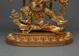 Explore the awe-inspiring presence of our Six-Arms Mahakala Statue, which was lovingly handmade by talented artisans. With a height of 20.9 inches and a base measuring 16.5 inches, this commanding statue is made of a copper body and is embellished with vivid paintings in gold and acrylic as well as 24K gold gilding. In Vajrayana Buddhism, Mahakala is a prominent protector deity. He is portrayed with six arms, each of which holds symbolic weapons and ceremonial utensils that symbolize his numerous strong and protective attributes.