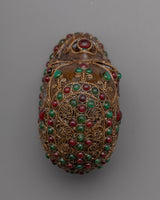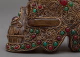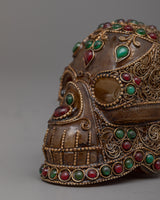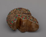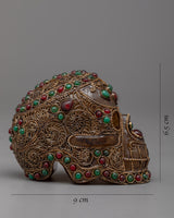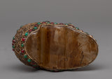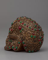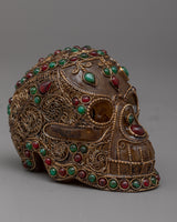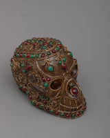 The Handcrafted Skull Crystal is expertly crafted on a crystal stone, highlighting its natural beauty and unique characteristics. The crystal stone is meticulously carved into the shape of a skull, resulting in an eye-catching and symbolic piece. Gemstones are embedded into the crystal to enhance its aesthetic appeal, adding a touch of sparkle and elegance. The silver plating highlights the details of the skull and creates a lovely contrast with the crystal. This handcrafted skull crystal is both meaningful and decorative, representing ideas like impermanence, transformation, and spiritual awakening.