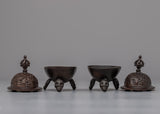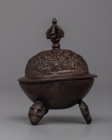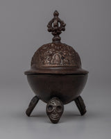 A Kapala set is a cup made of a human skull, frequently offered by worshipers of the fierce Tantric deities of Hindu and Buddhist. In Tibet, the skull cup is displayed on the Buddhist altar and is used to offer to the ferocious Dharmapala divinities either wine, which symbolizes blood, or dough cakes, which are shaped to resemble human eyes, ears, etc. The Kapala is fashioned from the oval upper section of a human cranium. It serves as a libation vessel for a vast number of Vajrayana deities, mostly wrathful.