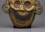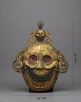 Presenting the Skull Mask Wall Hanging, an interesting work of art with great craftsmanship and spiritual meaning. The wall hanging, which weighs 0.824 kg and measures 44 cm in height by 34 cm in breadth, is crafted from a copper body and exquisitely gold-plated. The elaborate pattern and fine craftsmanship reflect the rich cultural legacy and spiritual practices connected to these masks in Tibetan Buddhism, where they stand for impermanence and protection.